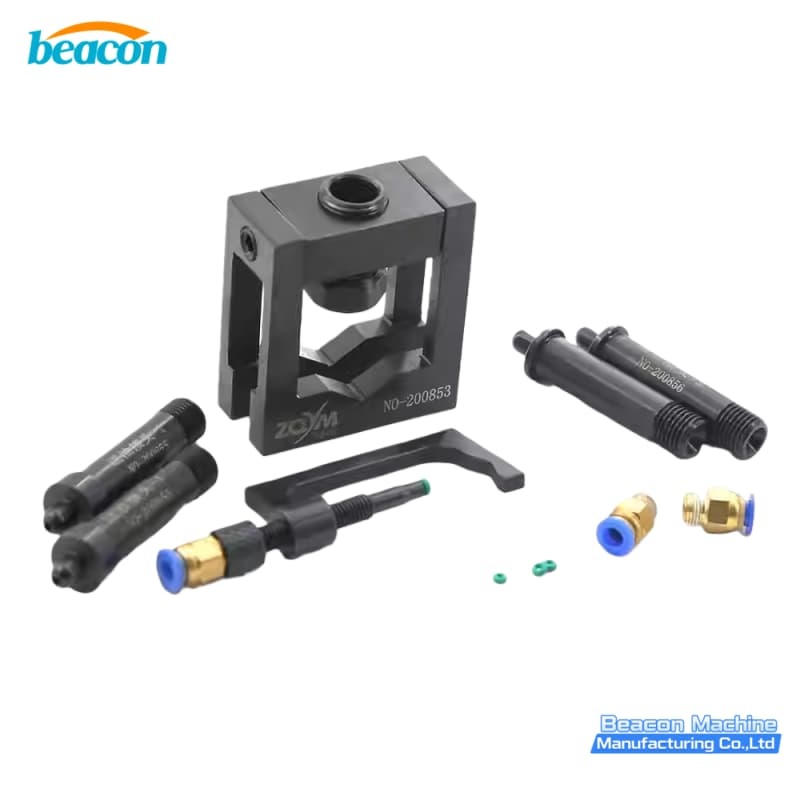 Designed for test fixtures, this adapter connects the fuel backflow (oil return) line. Features a versatile mechanism to fit various injector brands (Bosch, Denso, Delphi), ensuring leak-free routing to the measuring tank.